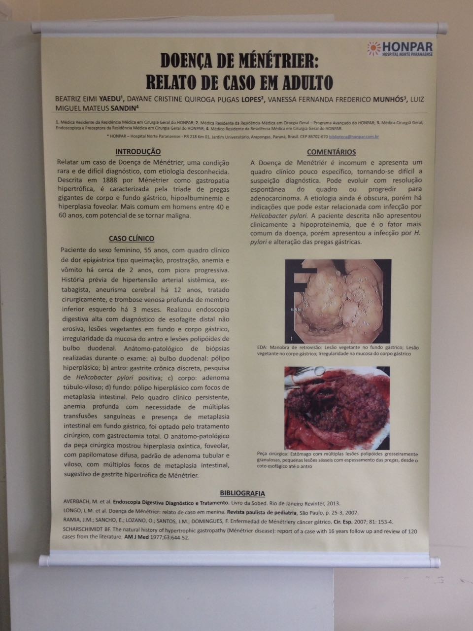 Os médicos residentes em Cirurgia Geral, Beatriz Eimi Yaedu e Luis Miguel Mateus Sandin, participaram no dia 29 de outubro da XV Semana Brasileira do Aparelho Digestivo. Apresentaram duas publicações de grande relevância ao meio clínico e acadêmico, "Colite Tuberculosa e Doença de Menetrier". O HONPAR parabeniza a estes residentes pelo amplo interesse em aprimorar seus conhecimentos.